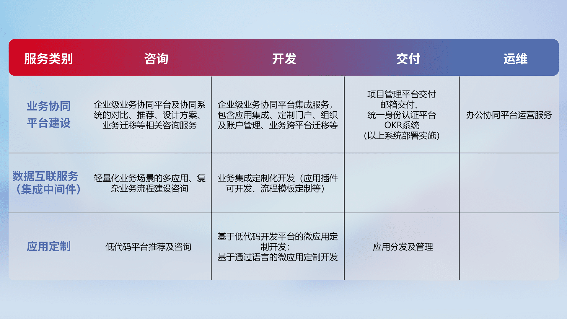 针对钉钉、、企微、、IDaas等平台级产品提供产品的规划、、方案、、、、交付、、、定制化开发等服务,,,实现如统一协同办公、、智能客户服务、、、混合会议管理、、、、智能数据查询、、等业务场景,,实现数字化转型。。