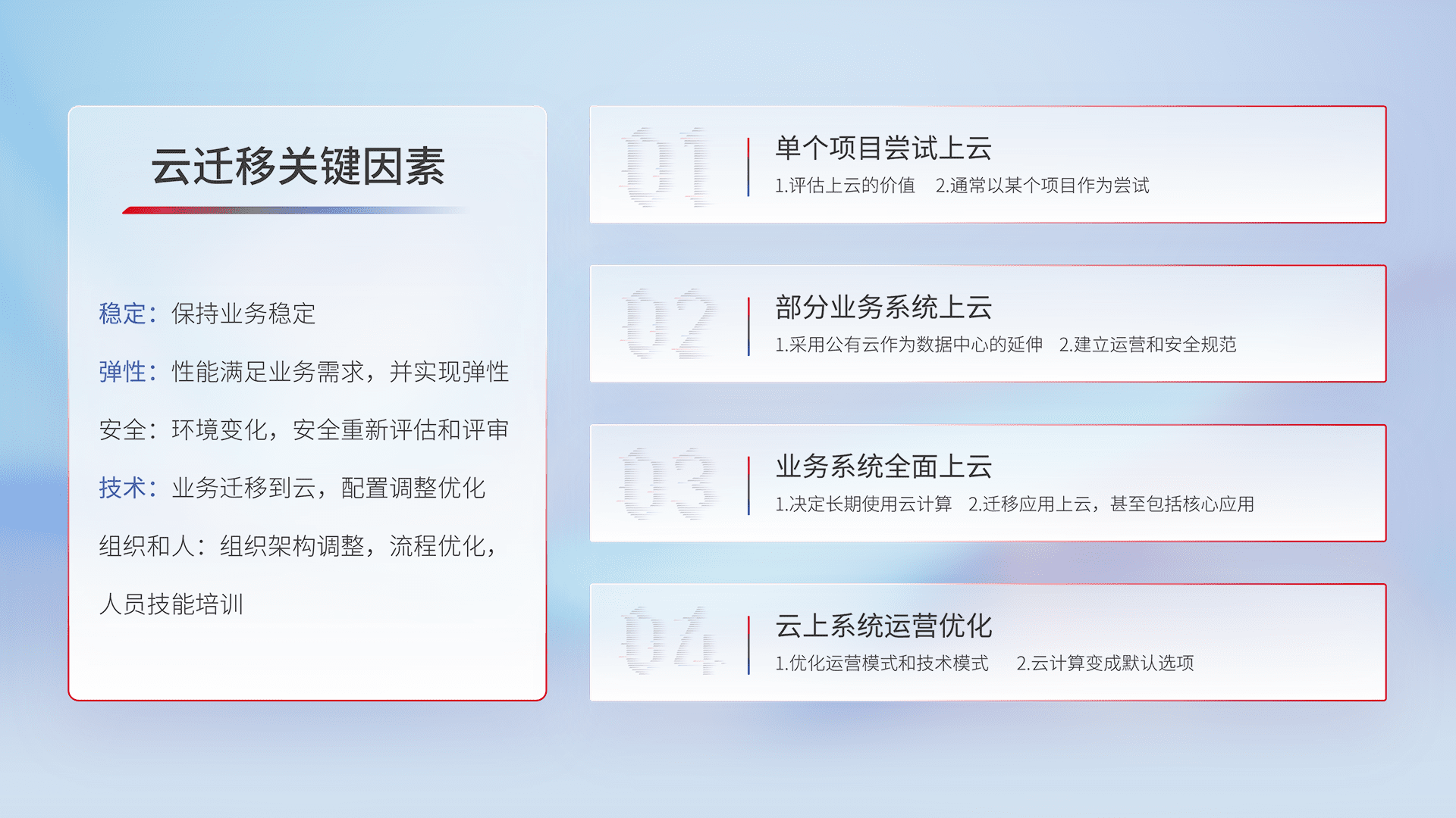 结合实际业务,,,,从规划设计、、、、云平台选型、、、、云原生改造、、、、数据迁移、、、、集成交付,,,迁移全过程为客户识别最佳上云路径,,,,做好风险识别管理,,设计网络架构、、、身份权限、、、、安全审计合规、、、操作审计、、日志审计、、监控告警策略、、、多站点容灾设计等,,,,对云上基础设施进行整体规划,,提升IT治理水平,,以满足弹性、、高可用、、高性能的需求。。。